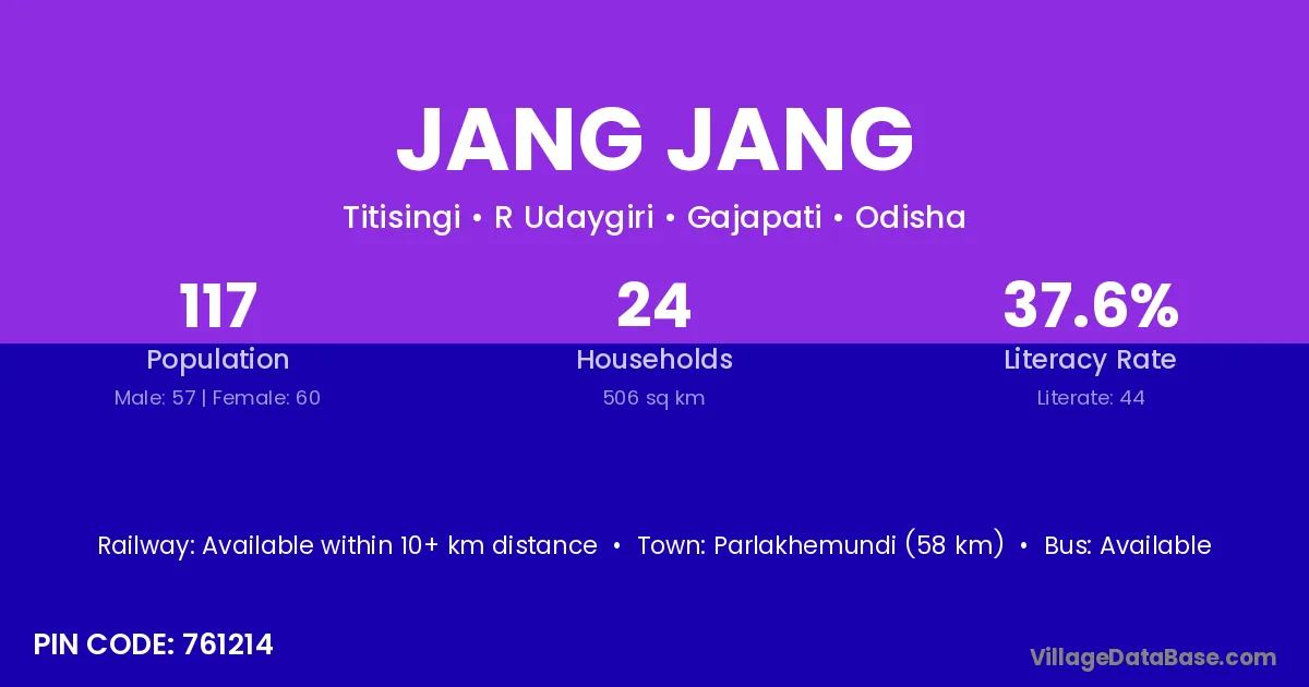 Parlakhemundi (58 km) is the nearest town to Jang Jang village for major economic activities and is located approximately 58 km away.