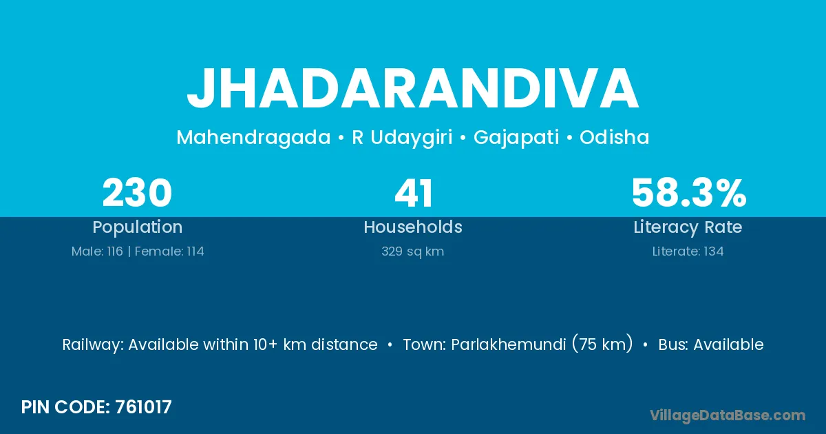 Parlakhemundi (75 km) is the nearest town to Jhadarandiva village for major economic activities and is located approximately 75 km away.