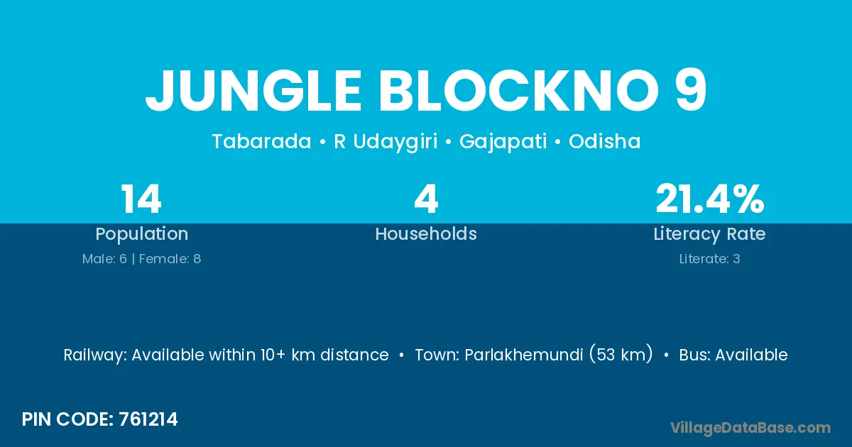 The literacy rate of Jungle Blockno 9 village is 21.43%. Male literacy stands at 50.00% and female literacy at 0.00%.