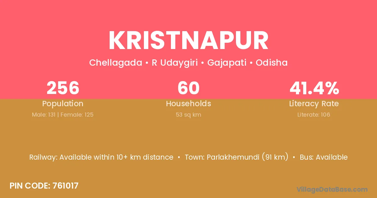 Parlakhemundi (91 km) is the nearest town to Kristnapur village for major economic activities and is located approximately 91 km away.