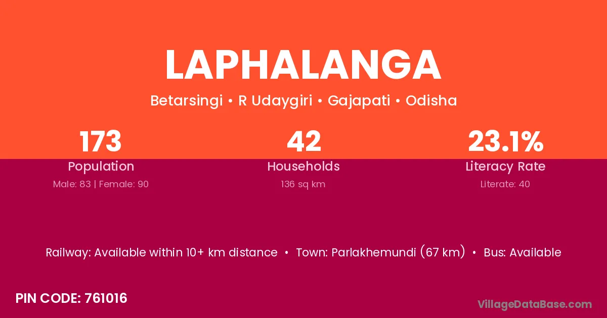 Parlakhemundi (67 km) is the nearest town to Laphalanga village for major economic activities and is located approximately 67 km away.