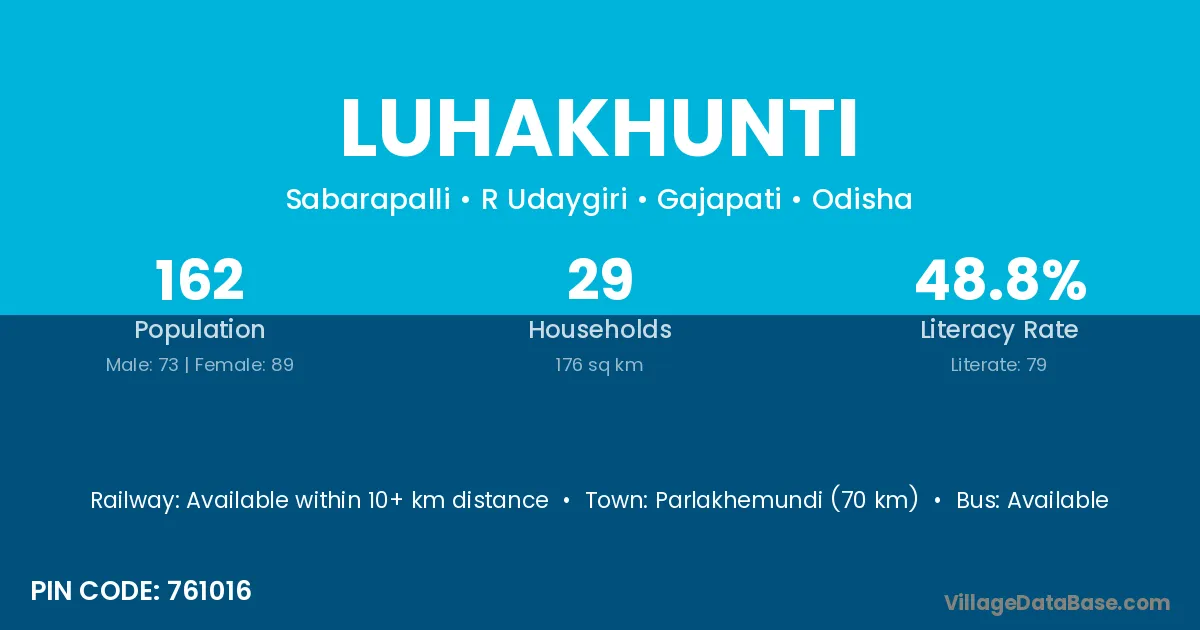 Parlakhemundi (70 km) is the nearest town to Luhakhunti village for major economic activities and is located approximately 70 km away.