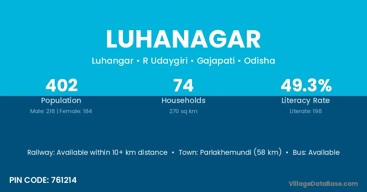 Parlakhemundi (58 km) is the nearest town to Luhanagar village for major economic activities and is located approximately 58 km away.