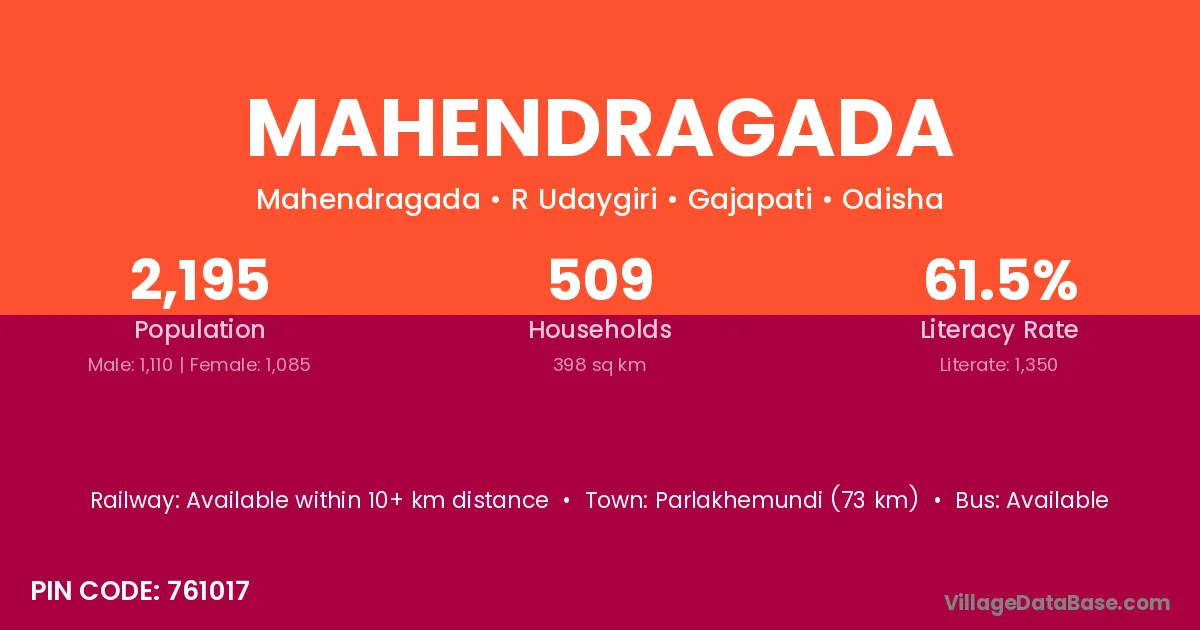 Parlakhemundi (73 km) is the nearest town to Mahendragada village for major economic activities and is located approximately 73 km away.