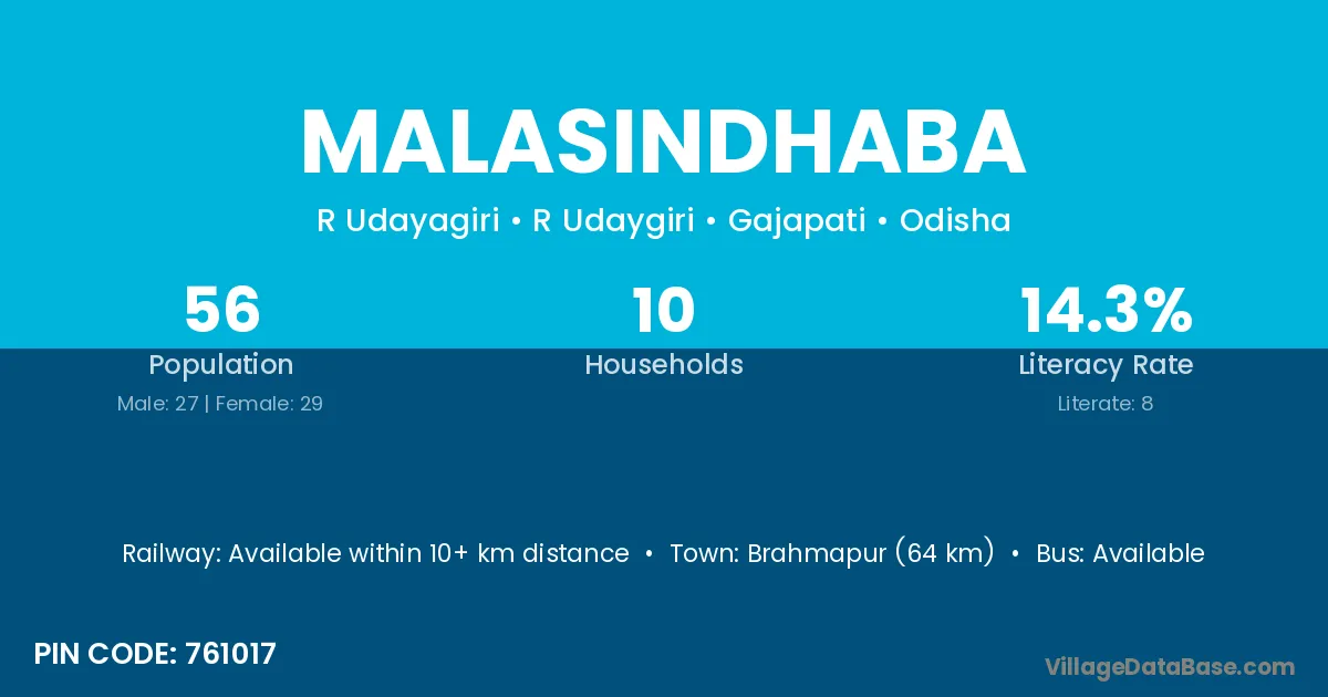 Brahmapur (64 km) is the nearest town to Malasindhaba village for major economic activities and is located approximately 64 km away.