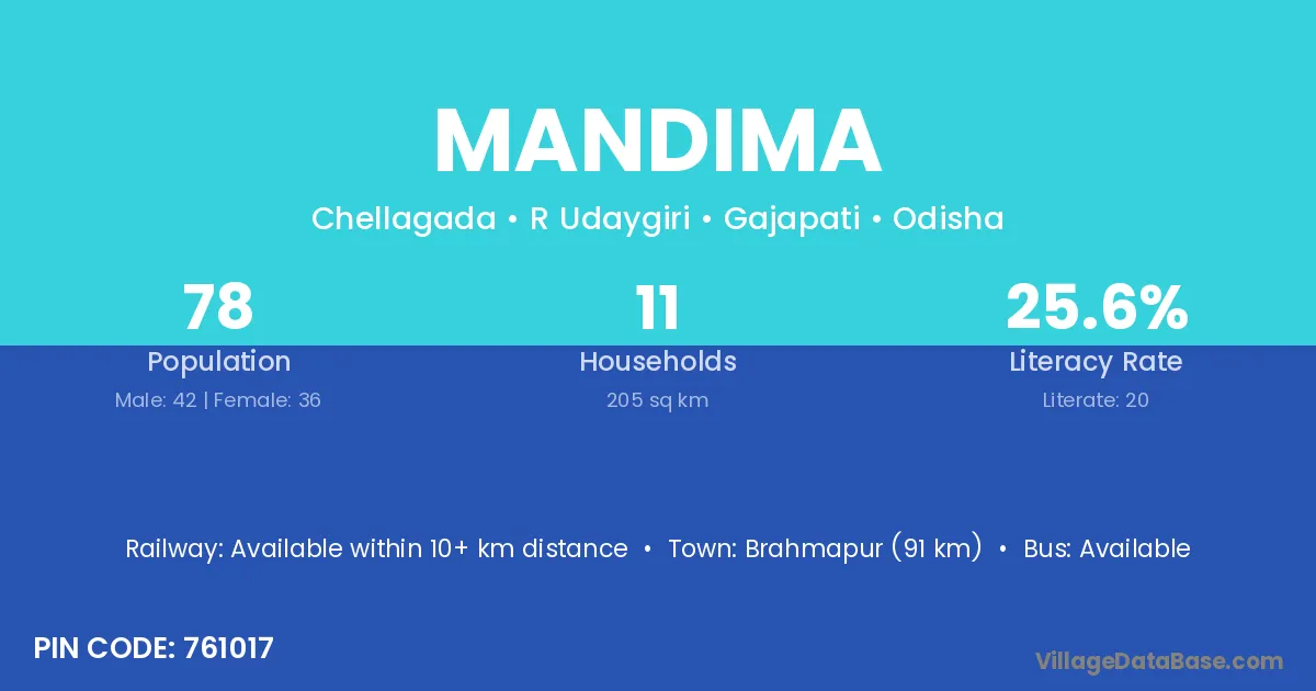 Brahmapur (91 km) is the nearest town to Mandima village for major economic activities and is located approximately 91 km away.