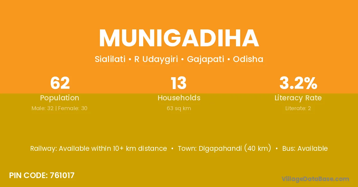 Digapahandi (40 km) is the nearest town to Munigadiha village for major economic activities and is located approximately 40 km away.