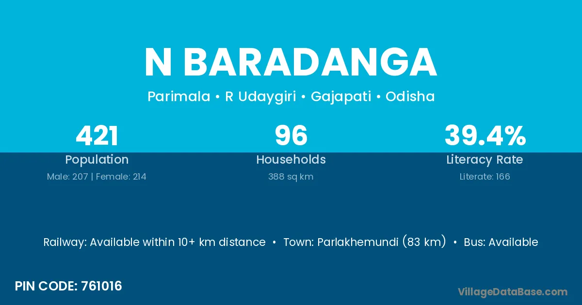 Parlakhemundi (83 km) is the nearest town to N Baradanga village for major economic activities and is located approximately 83 km away.
