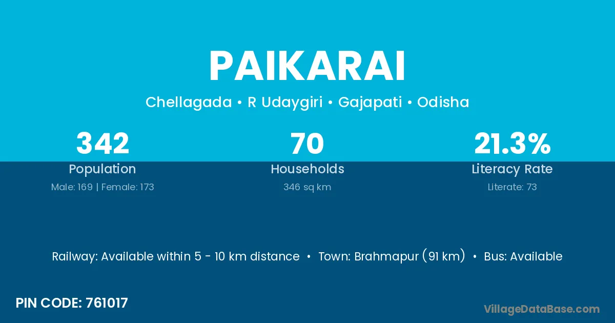 Brahmapur (91 km) is the nearest town to Paikarai village for major economic activities and is located approximately 91 km away.