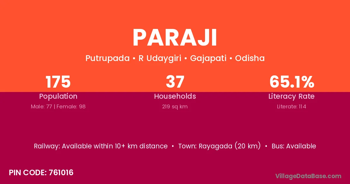 Rayagada (20 km) is the nearest town to Paraji village for major economic activities and is located approximately 20 km away.