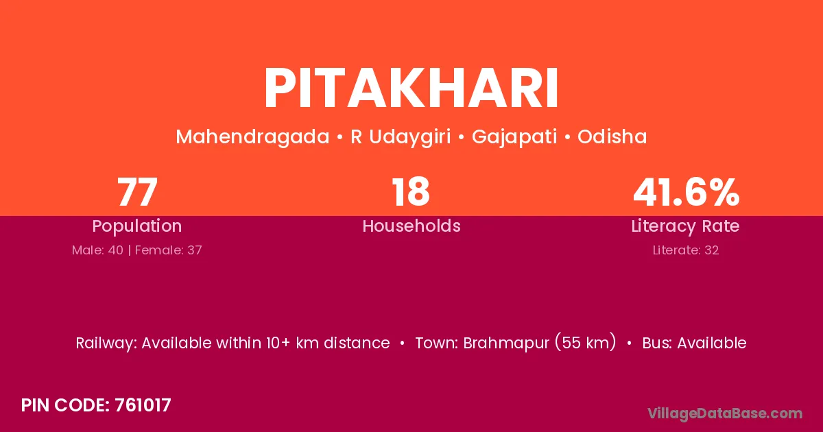 Brahmapur (55 km) is the nearest town to Pitakhari village for major economic activities and is located approximately 55 km away.