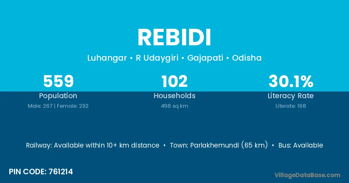 Parlakhemundi (65 km) is the nearest town to Rebidi village for major economic activities and is located approximately 65 km away.