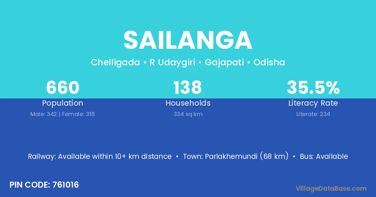 Parlakhemundi (68 km) is the nearest town to Sailanga village for major economic activities and is located approximately 68 km away.