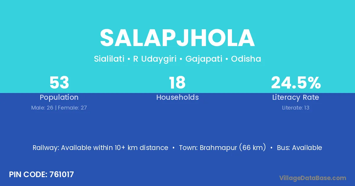 Brahmapur (66 km) is the nearest town to Salapjhola village for major economic activities and is located approximately 66 km away.