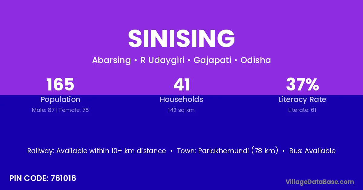 Parlakhemundi (78 km) is the nearest town to Sinising village for major economic activities and is located approximately 78 km away.