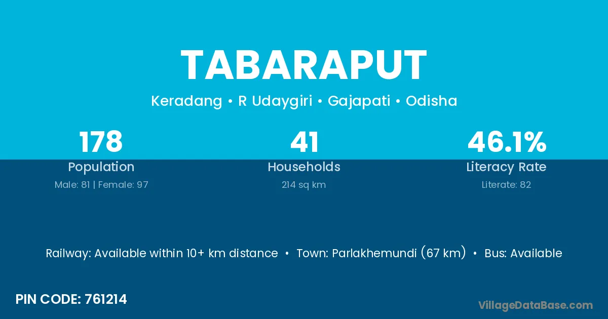 Parlakhemundi (67 km) is the nearest town to Tabaraput village for major economic activities and is located approximately 67 km away.