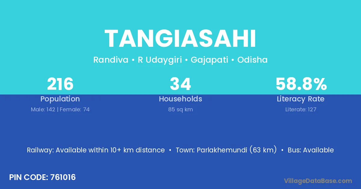 Parlakhemundi (63 km) is the nearest town to Tangiasahi village for major economic activities and is located approximately 63 km away.