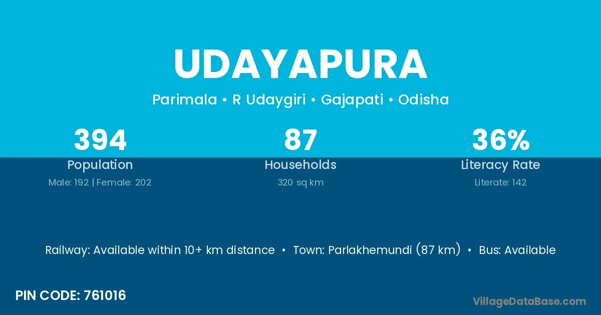 Parlakhemundi (87 km) is the nearest town to Udayapura village for major economic activities and is located approximately 87 km away.
