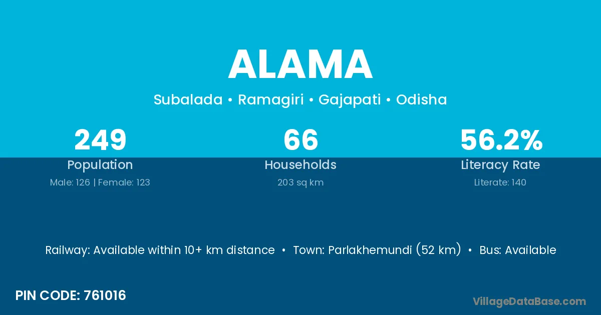 Parlakhemundi (52 km) is the nearest town to Alama village for major economic activities and is located approximately 52 km away.