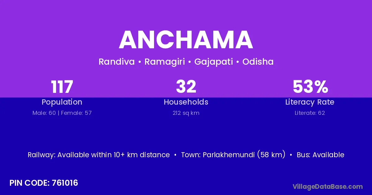 Parlakhemundi (58 km) is the nearest town to Anchama village for major economic activities and is located approximately 58 km away.