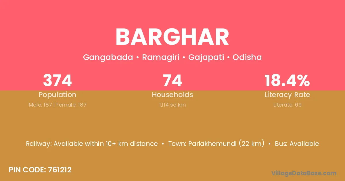 Parlakhemundi (22 km) is the nearest town to Barghar village for major economic activities and is located approximately 22 km away.