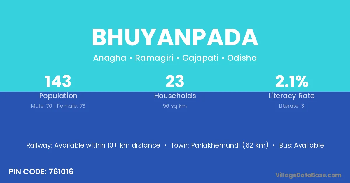 Parlakhemundi (62 km) is the nearest town to Bhuyanpada village for major economic activities and is located approximately 62 km away.