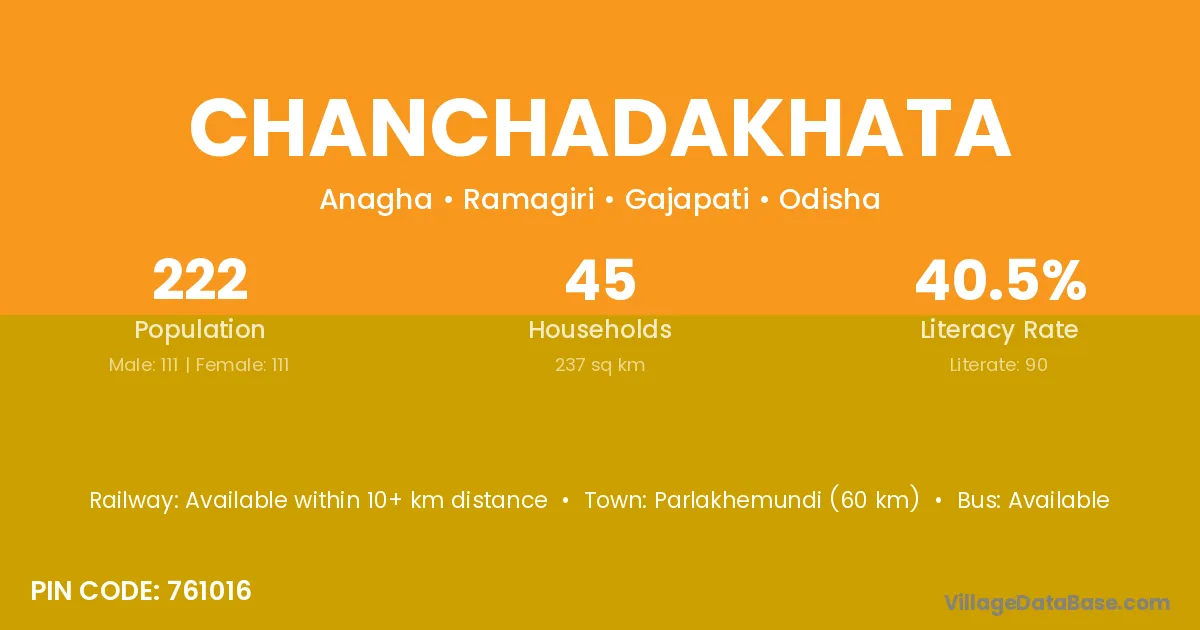 Parlakhemundi (60 km) is the nearest town to Chanchadakhata village for major economic activities and is located approximately 60 km away.