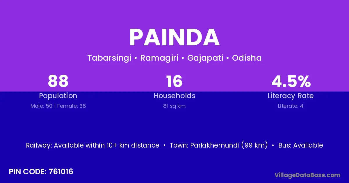 Parlakhemundi (99 km) is the nearest town to Painda village for major economic activities and is located approximately 99 km away.