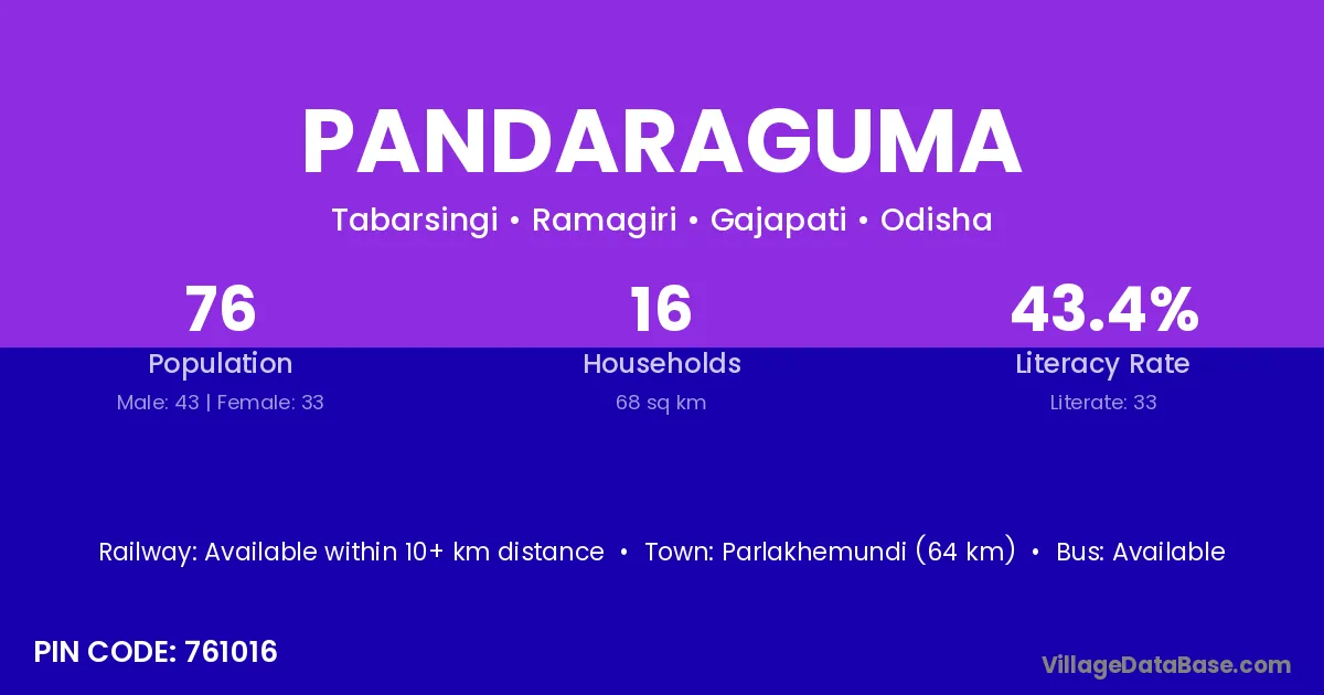 Pandaraguma village has a total population of 76 people, of which 43 are males and 33 are females.