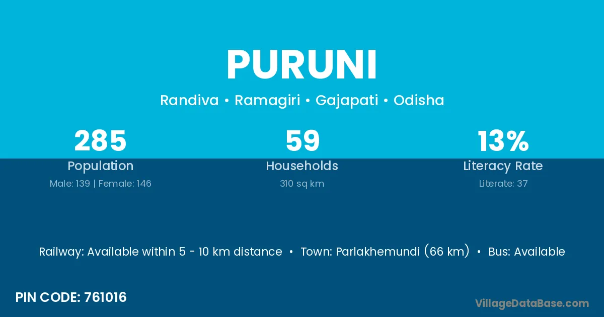Parlakhemundi (66 km) is the nearest town to Puruni village for major economic activities and is located approximately 66 km away.