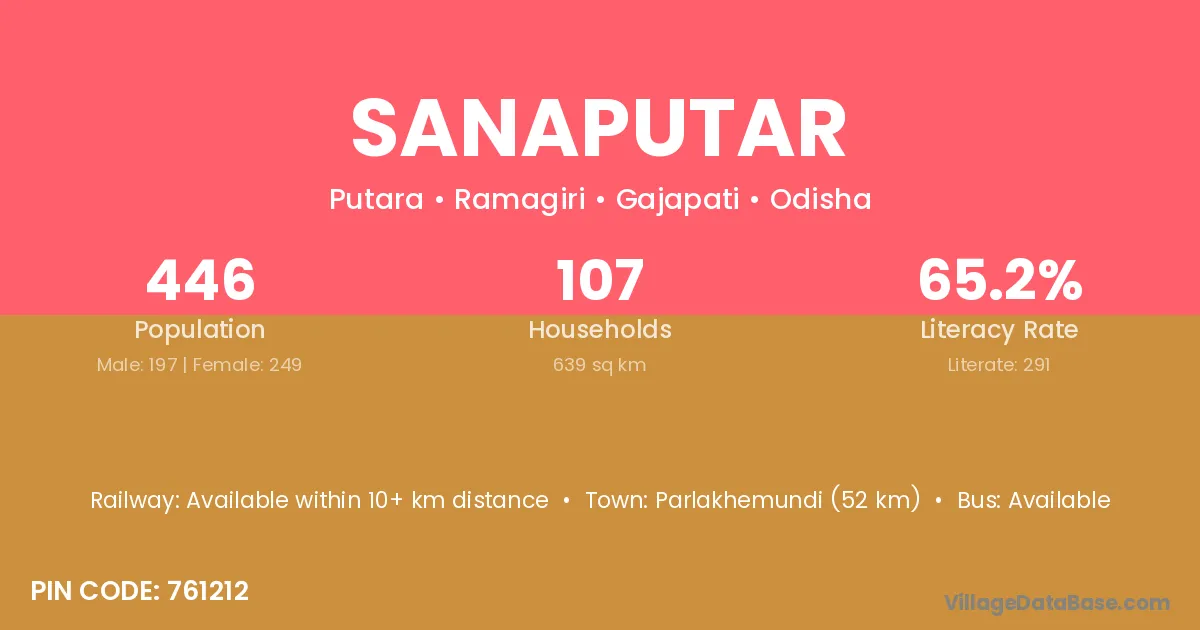Parlakhemundi (52 km) is the nearest town to Sanaputar village for major economic activities and is located approximately 52 km away.