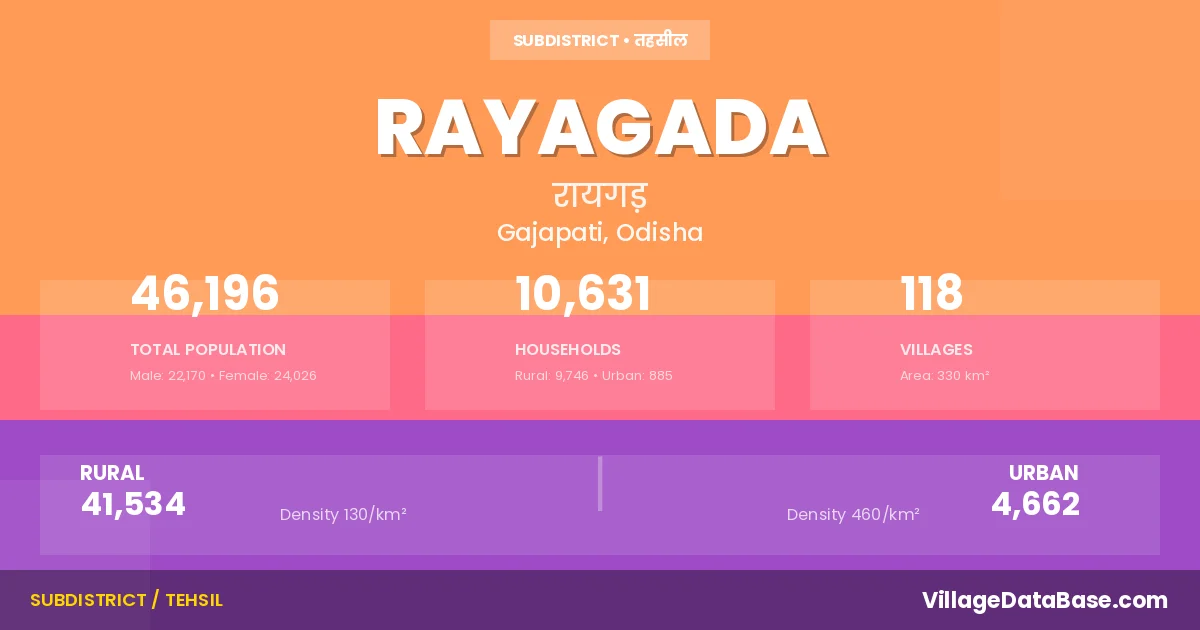 According to the 2011 census The total area of Rayagada Tehsil is 330 km², with a population of 46196 people. The population density is 140 inhabitants per square kilometre, and there are approximately 10631 houses in the sub district.