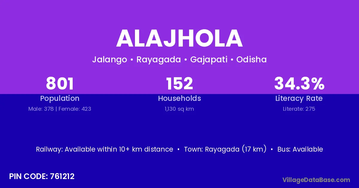 Rayagada (17 km) is the nearest town to Alajhola village for major economic activities and is located approximately 17 km away.
