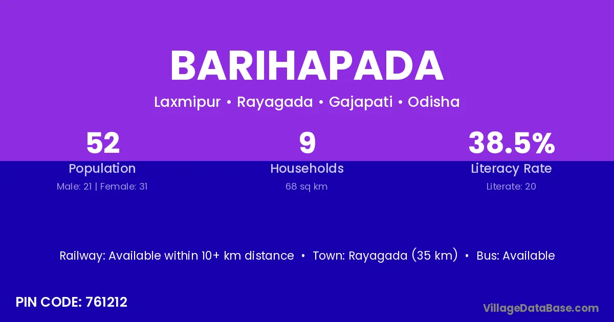 Rayagada (35 km) is the nearest town to Barihapada village for major economic activities and is located approximately 35 km away.