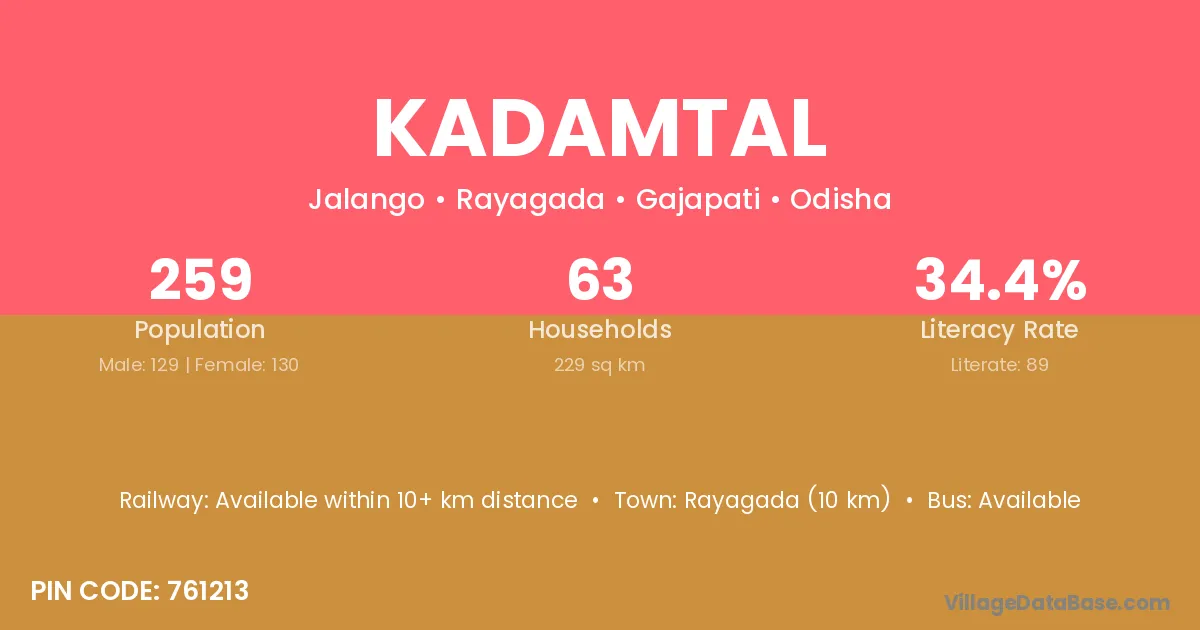 Rayagada (10 km) is the nearest town to Kadamtal village for major economic activities and is located approximately 10 km away.