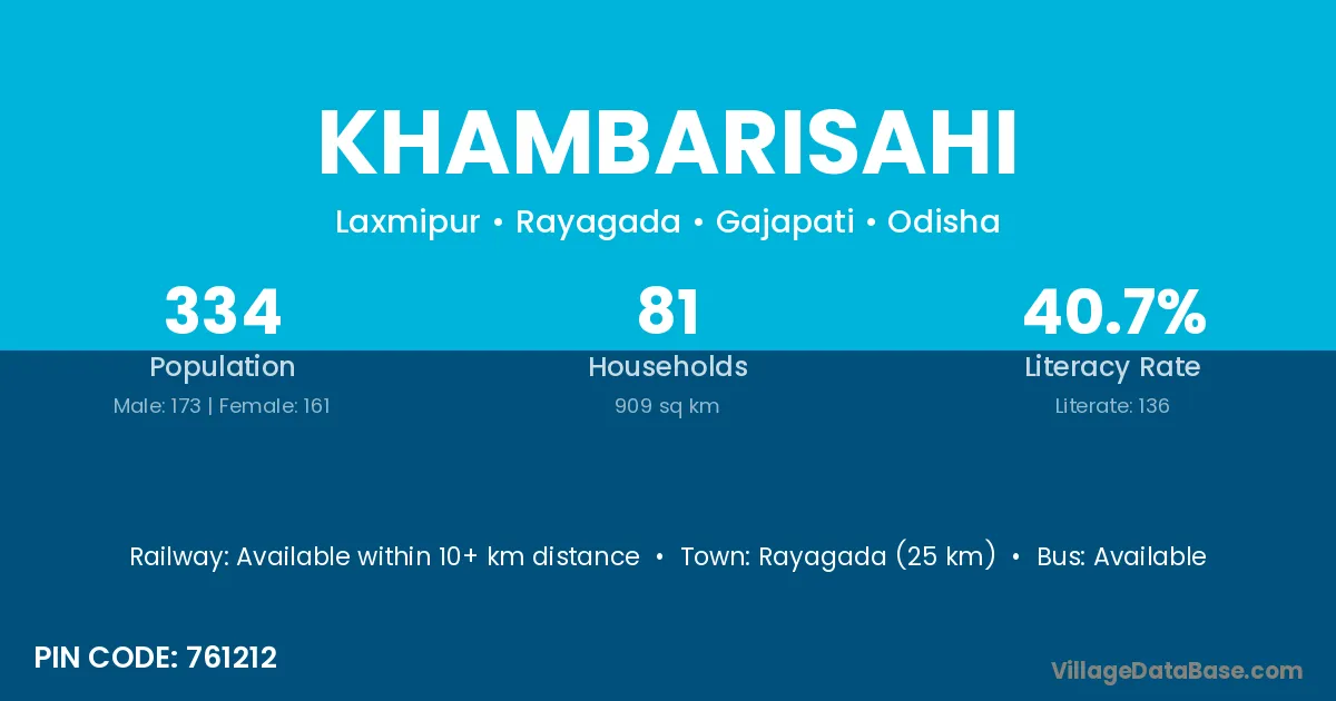 Rayagada (25 km) is the nearest town to Khambarisahi village for major economic activities and is located approximately 25 km away.