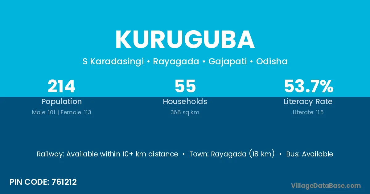 Rayagada (18 km) is the nearest town to Kuruguba village for major economic activities and is located approximately 18 km away.