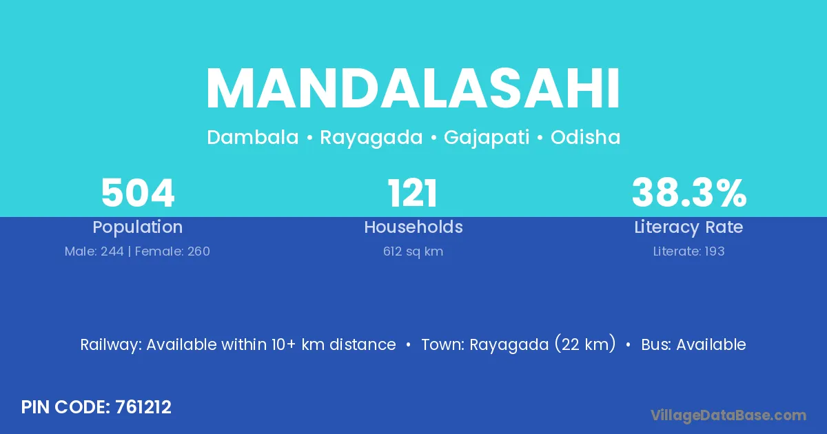 Rayagada (22 km) is the nearest town to Mandalasahi village for major economic activities and is located approximately 22 km away.