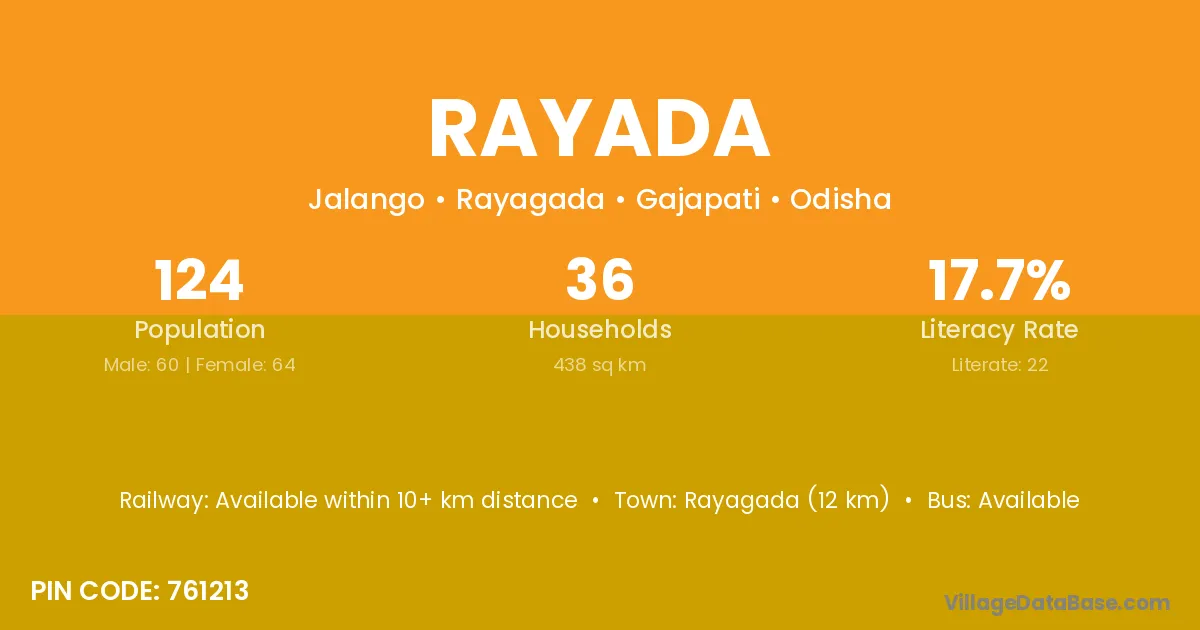Rayagada (12 km) is the nearest town to Rayada village for major economic activities and is located approximately 12 km away.