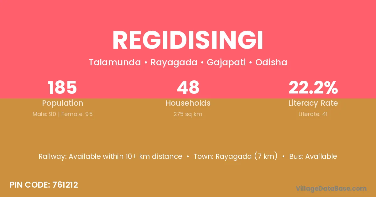 Rayagada (7 km) is the nearest town to Regidisingi village for major economic activities and is located approximately 7 km away.