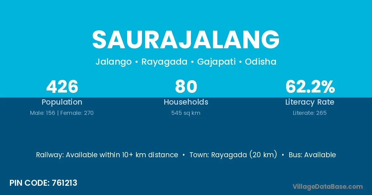 Rayagada (20 km) is the nearest town to Saurajalang village for major economic activities and is located approximately 20 km away.