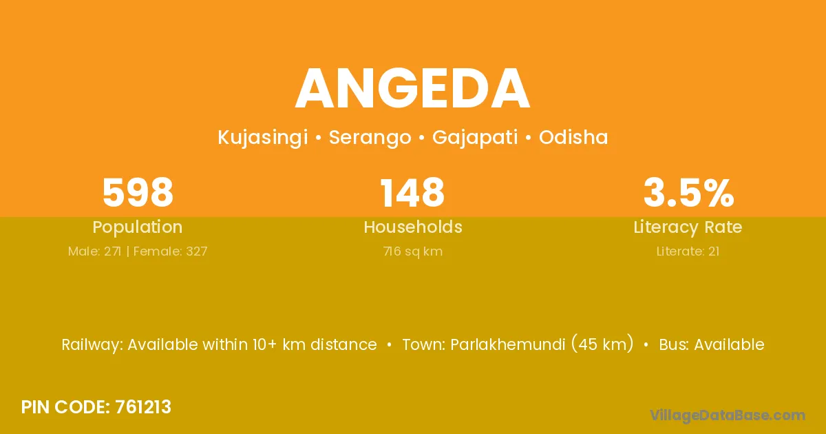 Parlakhemundi (45 km) is the nearest town to Angeda village for major economic activities and is located approximately 45 km away.
