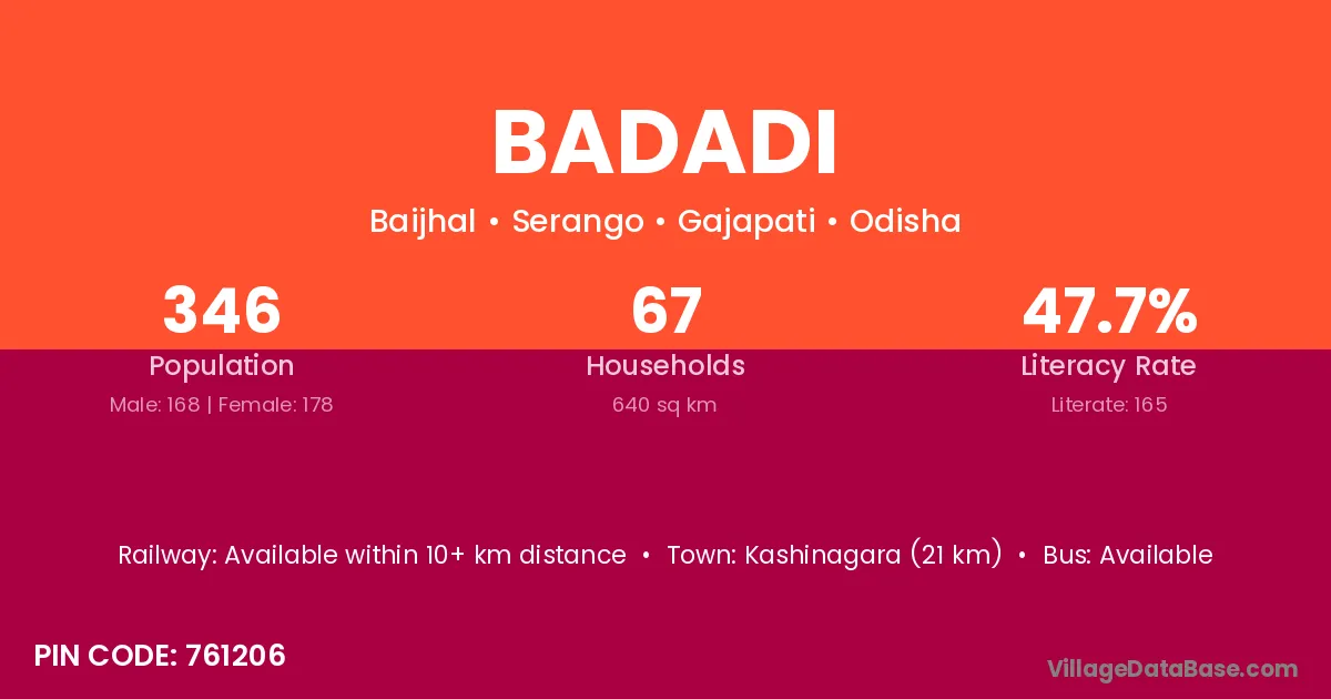 Kashinagara (21 km) is the nearest town to Badadi village for major economic activities and is located approximately 21 km away.