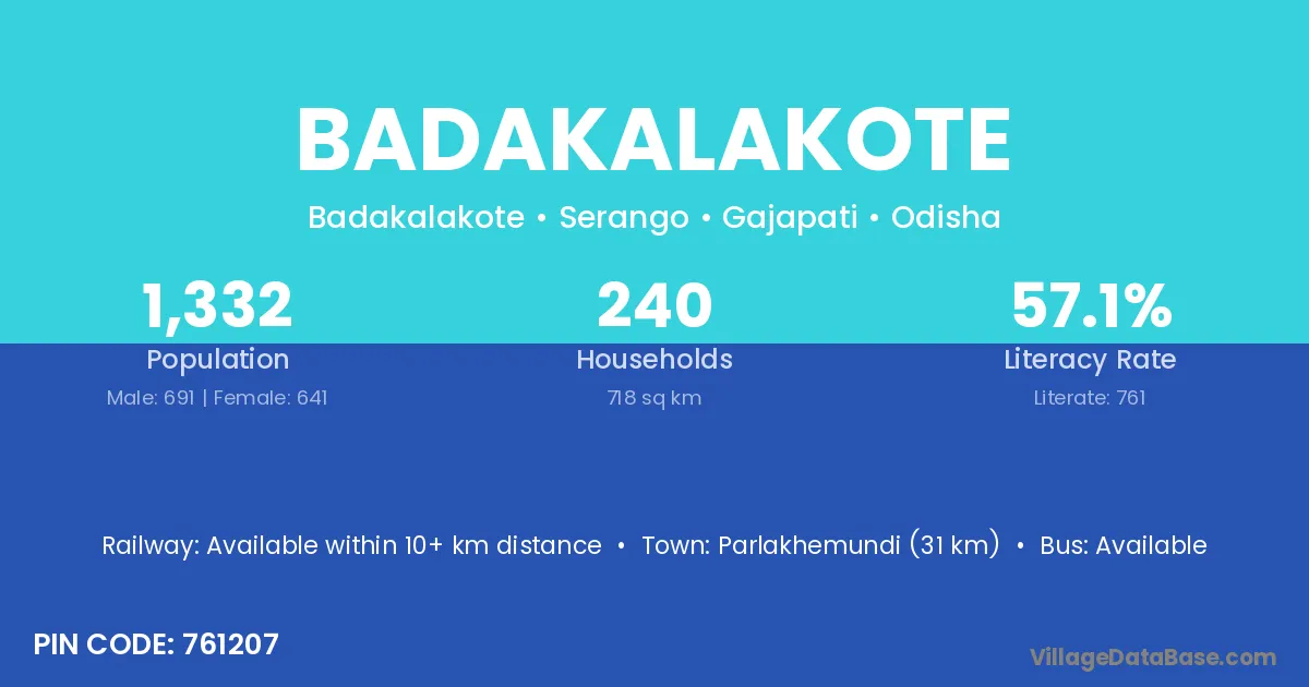 Parlakhemundi (31 km) is the nearest town to Badakalakote village for major economic activities and is located approximately 31 km away.