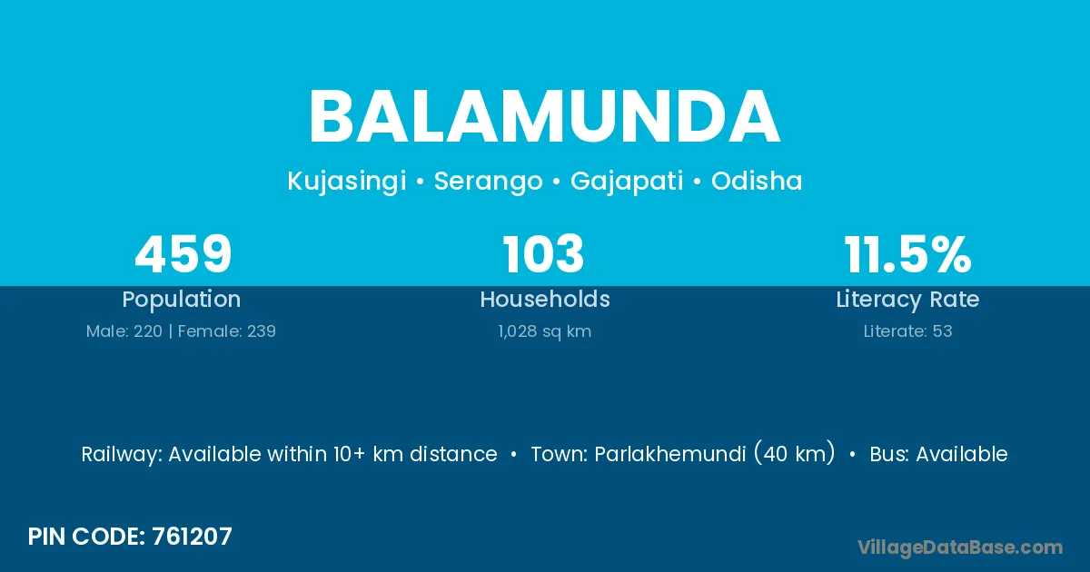 Parlakhemundi (40 km) is the nearest town to Balamunda village for major economic activities and is located approximately 40 km away.