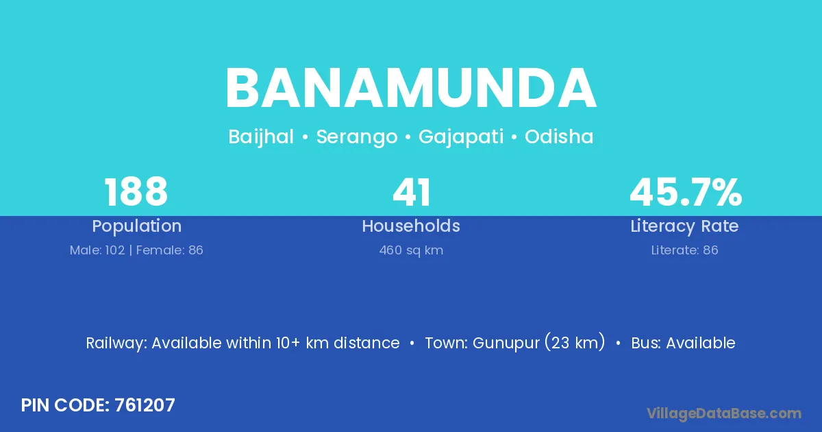 Gunupur (23 km) is the nearest town to Banamunda village for major economic activities and is located approximately 23 km away.