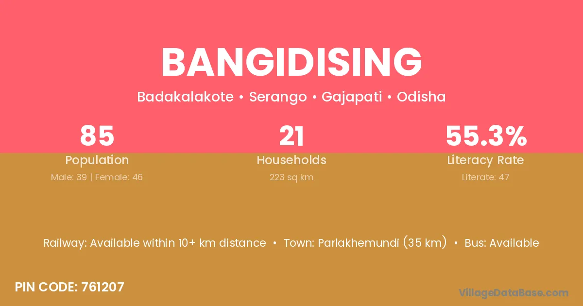 Parlakhemundi (35 km) is the nearest town to Bangidising village for major economic activities and is located approximately 35 km away.