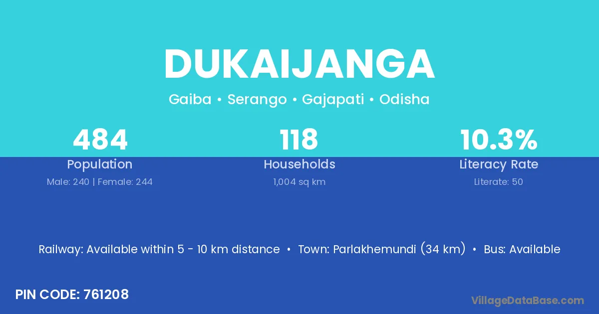 Parlakhemundi (34 km) is the nearest town to Dukaijanga village for major economic activities and is located approximately 34 km away.