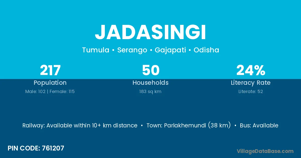 Parlakhemundi (38 km) is the nearest town to Jadasingi village for major economic activities and is located approximately 38 km away.