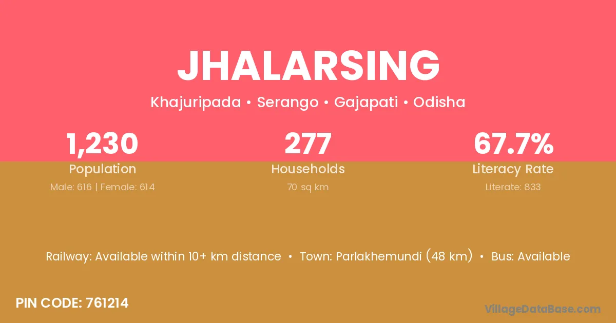Parlakhemundi (48 km) is the nearest town to Jhalarsing village for major economic activities and is located approximately 48 km away.